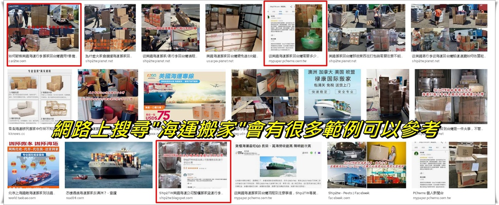 就是上網搜尋幾個關鍵字"海運國際搬家",就會有其他人的經驗分享等可以參考,也可以找到其他相關搬家公司提供服務。